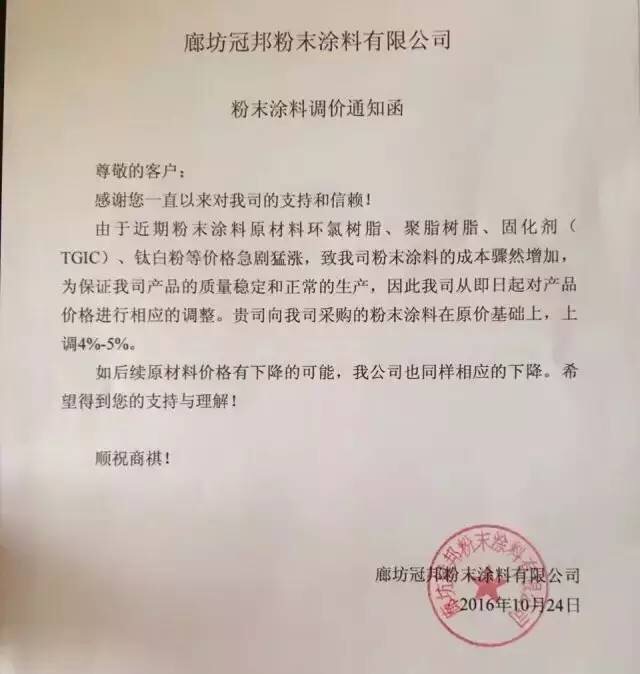 原创 2016-10-31 中国涂料采购网 涂料采购网 进入10月份以来,有不少涂料企业开始承受不住原材料不断上涨的成本压力,陆续宣布对产品价格进行调整。据小编的不完全统计,目前已宣布产品涨价的涂料企业有嘉宝莉、华润涂料、名洋家具漆、鸿昌涂料、创宇化工、大一涂料、首邦化工等。