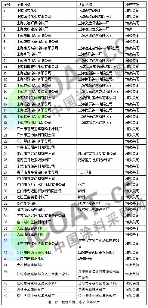 近期涂料企业怨声载道,上游原材料不停的涨价、下游对用户提价又提不上去,还被拖欠货款。外加环保违规关闭项目、罚款等等,都令涂料企业内忧外患,仅环保违规问题,2016年被关闭的项目与企业就达上千家,这给整个行业造成了较大的影响,很多企业被罚关停,致使原材料的货款都收不回来。在环保问题日趋严重的今天,中国涂料采购网整理了上海、广东部分省市被关闭的涂料项目名单如下。