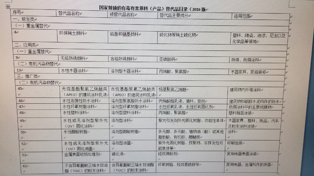 涂界记者注意到,2016年版《目录》分研发类、应用类、推广类,其中包括重金属替代、有机污染物替代。比如,应用类中鼓励以“水性木器涂料”替代“溶剂型木器涂料”;推广类中鼓励以“无烷基酚聚氧乙烯醚类(APEO)的建筑涂料乳液”替代“含烷基酚聚氧乙烯醚类(APEO)的建筑涂料乳液”,以“水性高弹性防水涂料”替代“溶剂型聚氨酯防水涂料”,以“水性环氧树脂涂料”替代“溶剂型环氧树脂涂料”,以“水性塑料涂料”替代“溶剂型塑料涂料”,以“水性或无溶剂型紫外光(UV)固化涂料”替代“溶剂型涂料”,以“水性醇酸树脂”替代“溶剂型醇酸树脂”,以“不含异氰脲酸三缩水甘油酯(TGIC)的粉末涂料”替代“含异氰脲酸三缩水甘油酯(TGIC)的粉末涂料”等。