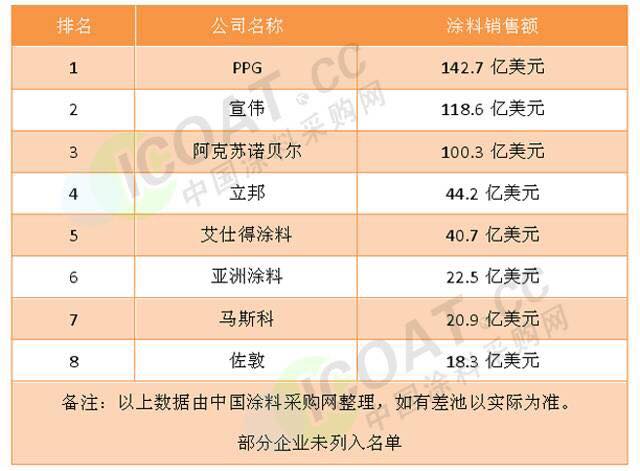 从上述列表中,我们可以看出,2016年PPG以142.7亿美元的涂料销售额位居榜首,宣伟以118.6亿美元的涂料销售额排名第二,阿克苏诺贝尔以100.3亿美元的涂料销售额排名第三。佐敦以18.3亿美元涂料销售额排名最后。其中前三名销售额差距不大,但与后几名有一定的差距。