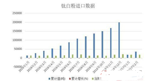2016年一、二月份钛白粉进口量为18635吨,2017年一、二月份钛白粉进口量为36517吨比去年同期增加了38%。