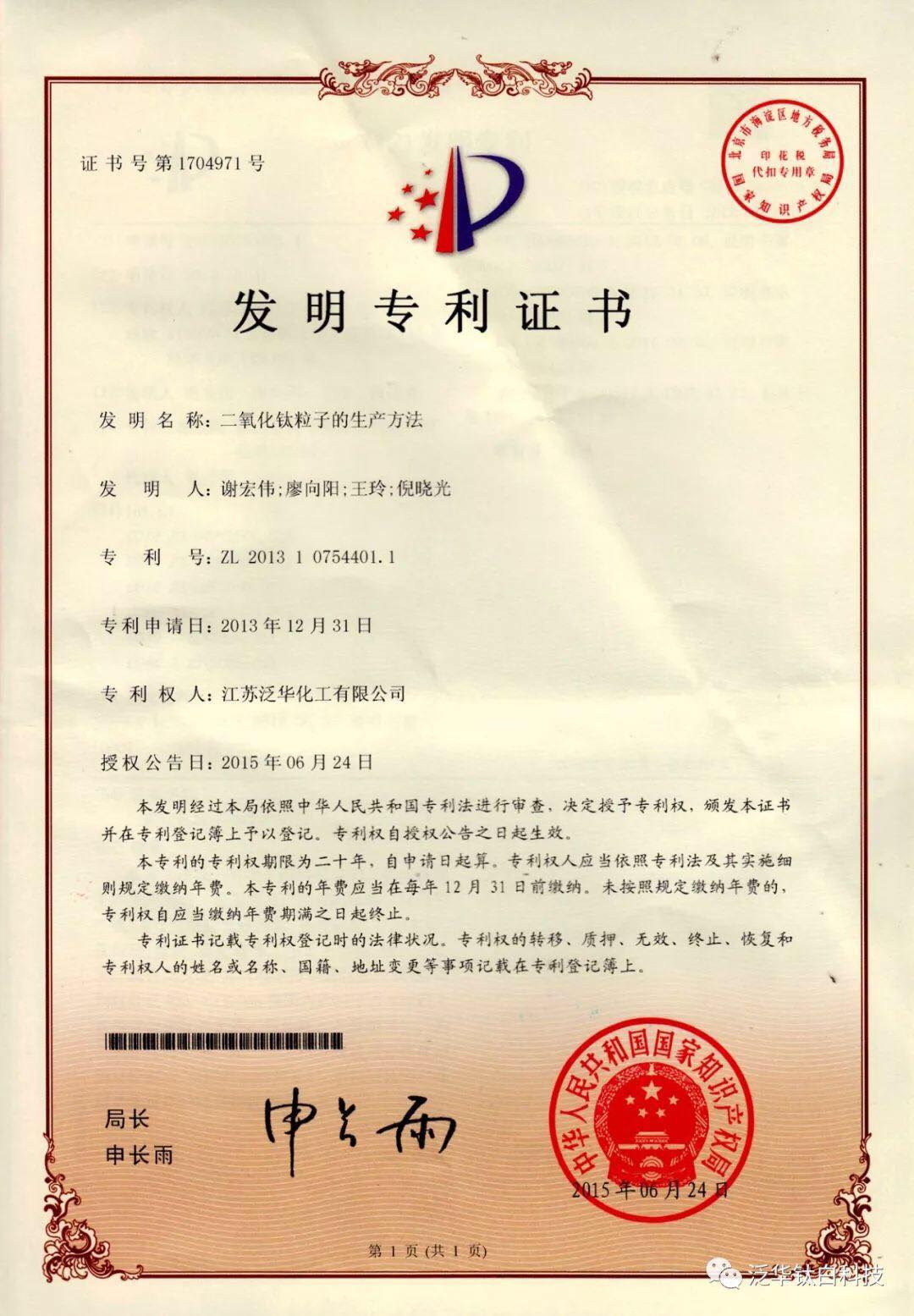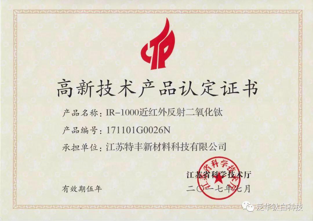 时近年底,泛华化学捷报频传,喜事连连。近日,泛华化学子公司特丰新材的技术专利产品“近红外反射二氧化钛 IR-1000”获江苏省科技厅颁发的“高新技术产品认定证书”,进一步证明了IR-1000产品性能的先进性。
