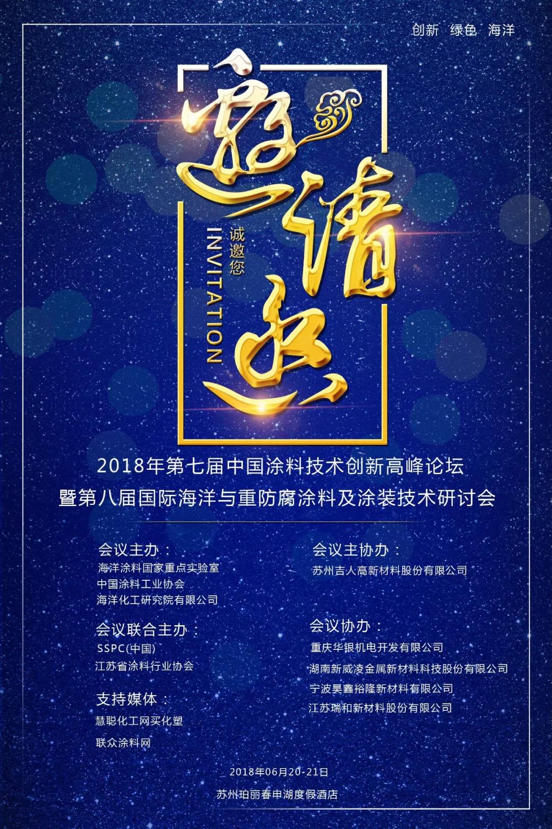 为探讨涂料领域的科学与技术问题,分享涂料相关领域的基础研究与应用研究成果,同时也为高校、科研院所和涂料企业及终端用户搭建产学研及应用交流平台,并通过对涂料及涂装应用相关领域近年来热点问题和未来发展趋势等研讨,以提升我国涂料行业自主创新能力,促进涂料产业可持续发展。由海洋涂料国家重点实验室、中国涂料工业协会、海洋化工研究院有限公司主办,SSPC(中国)、江苏省涂料行业协会联合主办的“2018年第七届中国涂料技术创新高峰论坛暨第八届国际海洋与重防腐涂料及涂装技术研讨会”将于2018年6月20-21日在江苏苏州召开,打造行业内最具影响力的涂料技术及应用交流平台,期待您的参与。