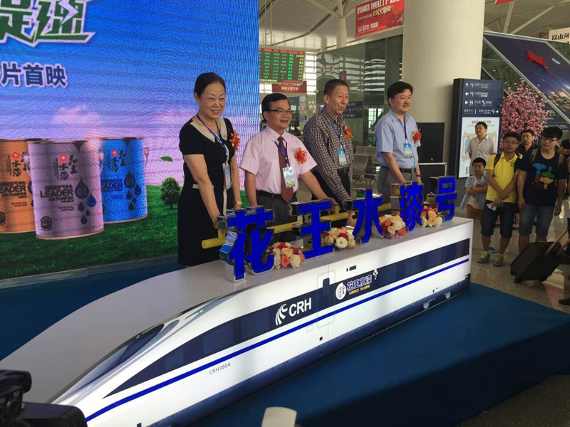 6月5日9:30分,为低碳生活提速﹒由广东花王涂料有限公司主办的冠名高铁列车“花王水漆”号首发式在南昌西高铁站隆重举行。中国涂料工业协会会长孙莲英、巴德士集团公司董事长方学平、涂料行业著名专家施青林、永达传媒总裁周志强、铁路局的相关领导以及巴德士销售总监、媒体、经销商参加。此次冠名高铁列车“花王水漆”号南昌西—广州南G1401车次,于6月5日上午7:29分从南昌西驶往广州南,开启了“花王”水漆品牌往南昌至广州的靓丽行程。“花王水漆”号属于首家民企冠名高铁列车,而在高铁列车车身外彩贴涂料品牌标识在全国涂料界也是首例,开创了涂料企业冠名高铁的先河!