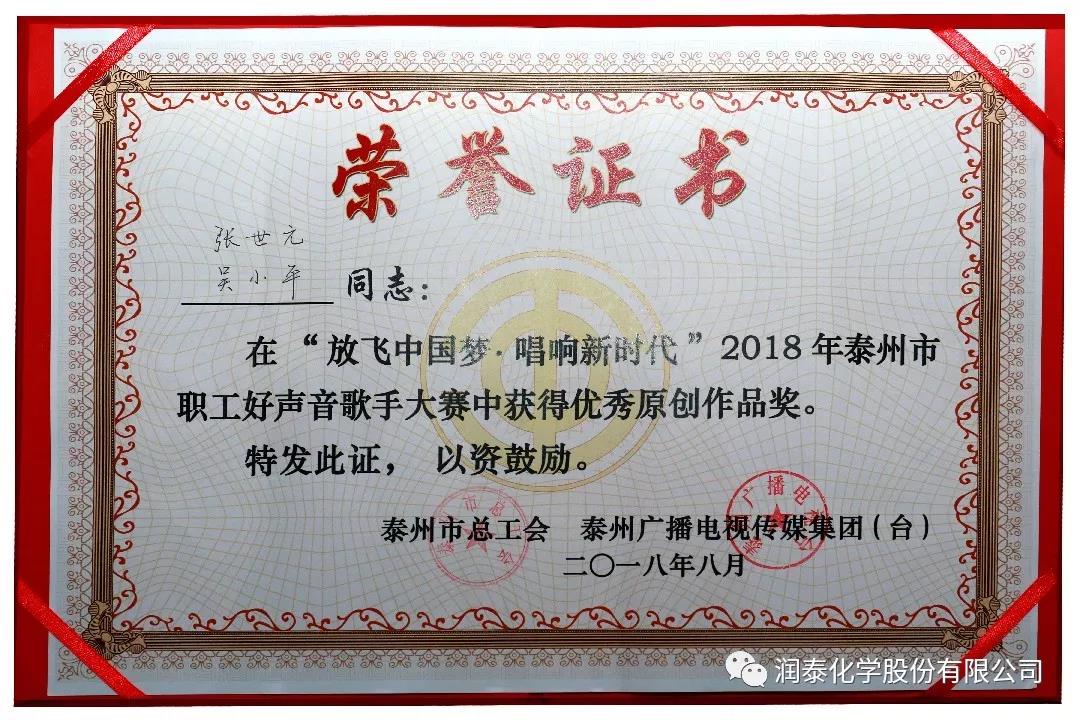 本次大赛分业余组和专业组两场比赛,由姜堰区总工会推选,由傅晓敏、梁馀平领唱,润泰股份员工艺术团合唱的润泰股份厂歌《润泰之歌》参加了专业组的比赛,并以优异的成绩获得专业组三等奖和优秀原创作品奖,这也是整场比赛中唯一一个获得双奖的参赛作品。