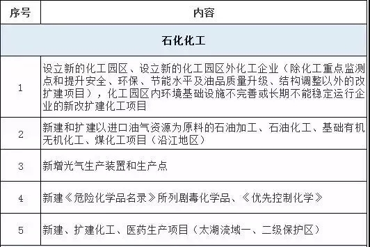 同时,江苏省配套出台了《江苏省产业结构调整限制、淘汰和禁止目录》,其中,禁止类项目为:设立新的化工园区、设立新的化工园区外化工企业(除化工重点监测点和提升安全、环保、节能水平及油品质量升级、结构调整以外的改扩建项目),化工园区内环境基础设施不完善或长期不能稳定运行企业的新改扩建化工项目;新建和扩建以进口油气资源为原料的石油加工、石油化工、基础有机无机化工、煤化工项目(沿江地区);新建《危险化学品名录》所列剧毒化学品、《优先控制化学》;新建、扩建化工、医药生产项目(太湖流域一、二级保护区)。