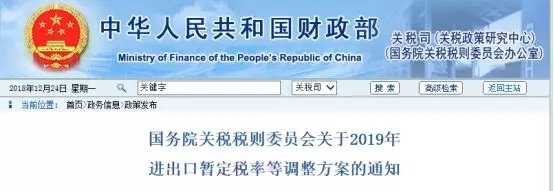 近日,国务院关税税则委员会发布《国务院关税税则委员会关于2019年进出口暂定税率等调整方案的通知》,为促进经济高质量发展和进出口贸易稳定增长,根据《中华人民共和国进出口关税条例》的相关规定,自2019年1月1日起对部分商品的进出口关税进行调整,调整方案如下: