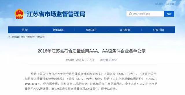 近日,江苏省市场监督管理局传来喜讯,江苏冠军科技集团股份有限公司通过评审考核及公示,成为溧水区第一家成功入围“2018年江苏省质量信用评价AA级”的企业。