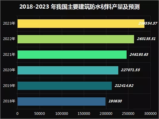 同时,我国主要建筑防水材料供需仍存在较大的缺口。从供给角度而言,2018-2023 年我国主要建筑防水材料产量及预测情况如下: