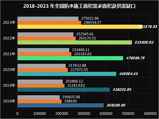 建筑防水材料可应用于房屋建筑、铁路、地下管廊等多个领域,仅从建筑房屋对防水材料的需求角度而言,建筑防水材料行业未来的市场容量直接取决于建筑房屋施工和维修面积。在建项目的防水施工面积占建筑面积的比例平均为 32.15%,竣工项目该指标的比例为32.83%,据此测算,2018-2023 年全国防水施工面积需求面积及供需缺口如下: