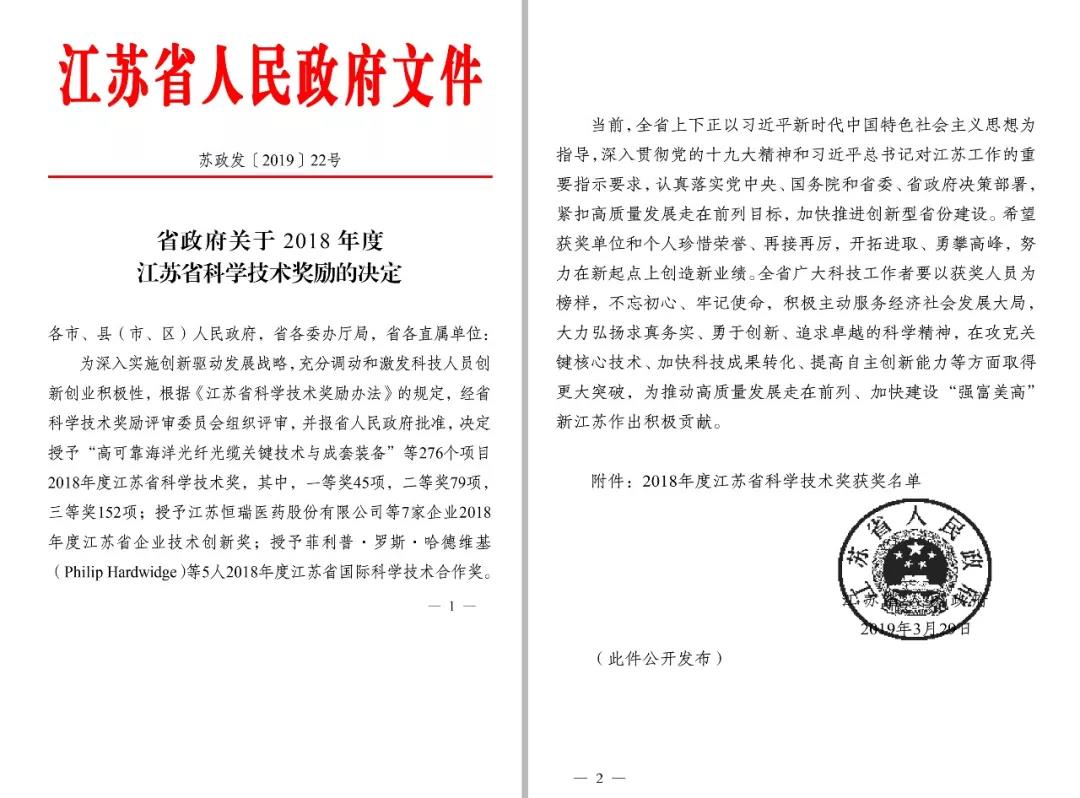 《省政府关于2018年度江苏省科学技术奖励的决定》