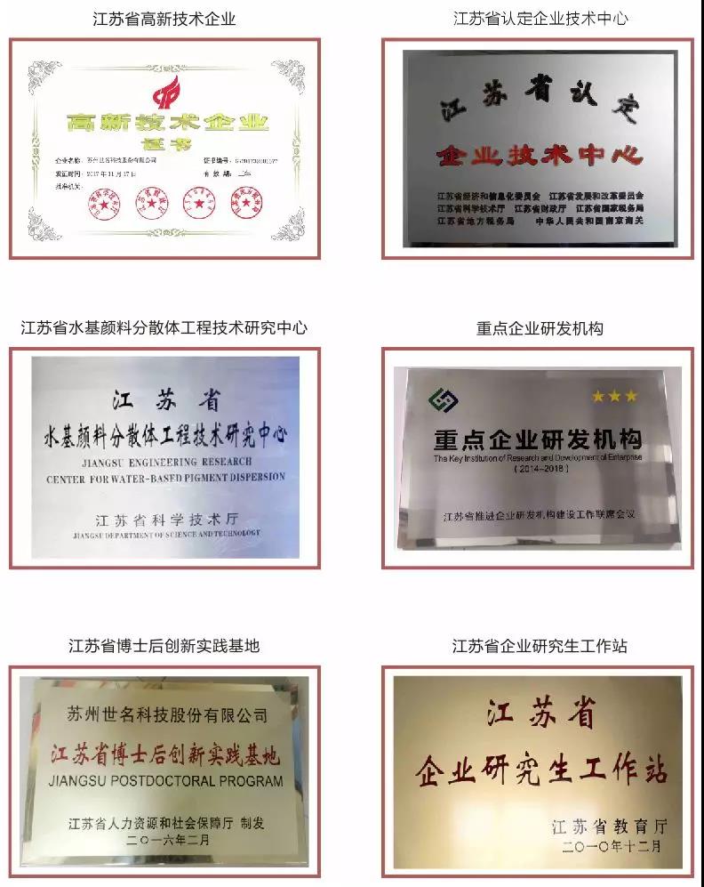 世名科技始终坚持走自主创新之路,集科技研发、成果转化、生产销售、技术服务于一体,近年来已完成和正在实施的国家、省、市等各级科研项目40余项,参与起草和修订国标、行标40余项。公司拥有省企业重点研发机构、省认定企业技术中心、省水基颜料分散体工程技术研究中心和省博士后创新实践基地等多个省级科研平台,先后承担了国家重点研发计划、省成果转化专项资金项目、省科技支撑计划、省自然科学基金等多个科技项目。