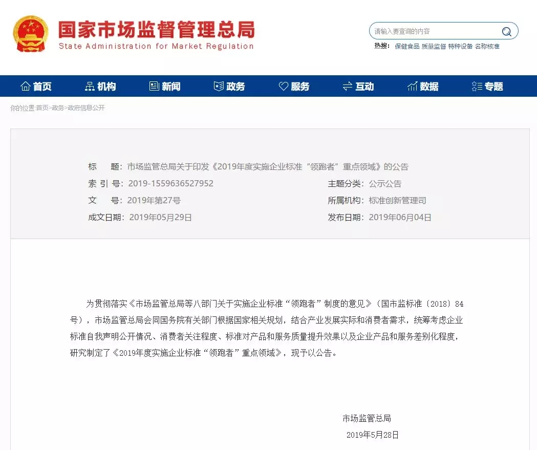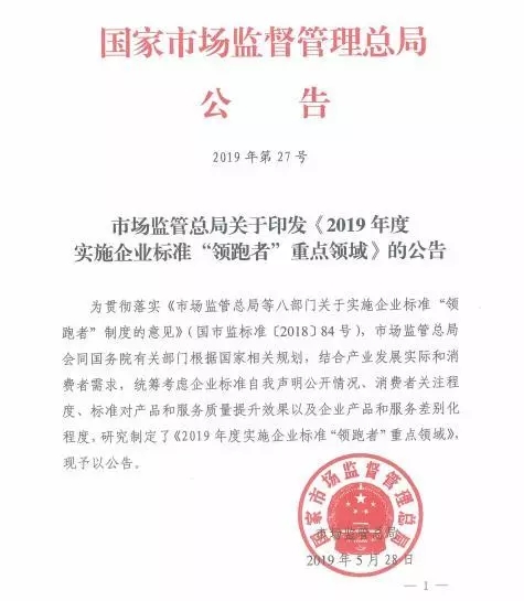2019年5月28日,市场监管总局关于印发《2019年度实施企业标准“领跑者”重点领域》的公告。其目的,主要是为了贯彻落实《市场监管总局等八部门关于实施企业标准“领跑者”制度的意见》(国市监标准〔2018】84号)——通过高水平标准引领,增加中高端产品和服务有效供给,支撑高质量发展的系列鼓励性政策。