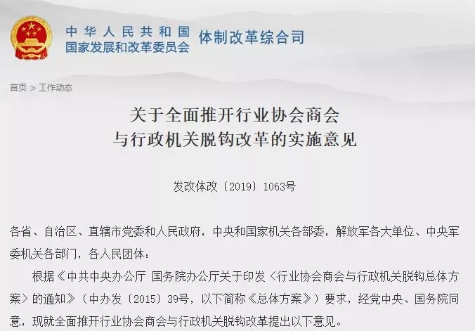 根据《中共中央办公厅 国务院办公厅关于印发〈行业协会商会与行政机关脱钩总体方案〉的通知》(中办发〔2015〕39号,以下简称《总体方案》)要求,经党中央、国务院同意,现就全面推开行业协会商会与行政机关脱钩改革提出以下意见。
