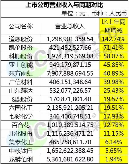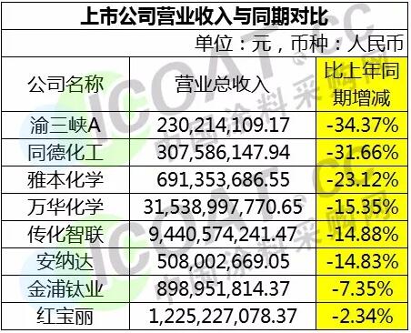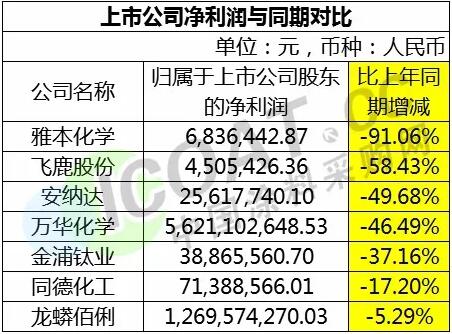 龙蟒佰俐、万华化学等7家上市公司出现了同比减少,其中雅本化学归属于上市公司股东的净利润为683.64万元,同比减少91.06%。这个数值实在是令人震惊不已。但据雅本化学半年报告分析,出现这种情况的原因是其主要生产基地南通雅本受2月底发生的废水处理区域安全事故影响,意外停产3个多月,影响了二季度的生产,使得二季度业绩下行,依靠前期产品库存以及医药等业务收入难以覆盖整体运行成本,因此上半年业绩较去年同期下降。其他上市公司半年报中也纷纷指出,由于外部环境复杂严峻,国内的经济也面临了不少压力,下游市场需求不足,价格波动下行,多种原因推动企业上半年利润同比减少,并相信会在下半年依靠自身的技术,努力开拓市场,将会有更好的成绩出现。
