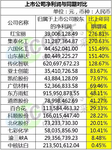 而在上半年归属于上市公司股东的净利润方面,则出现了两极分化的情况。凯伦股份、山东赫达等16家上市公司较上年同期均有所增长,其中红宝丽归属于上市公司股东的净利润为3900万元,同比增长276.81%,可谓是翻了2倍,集泰化工紧随其后,以3128万元的归属于上市公司股东的净利润,同比增长270.63%位列第二名。