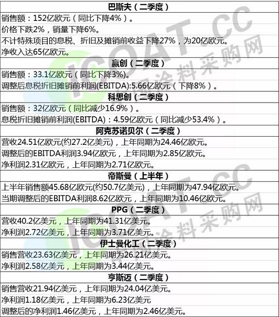 通过以上数据可以看出,巴斯夫、赢创、阿克苏诺贝尔、PPG等知名化工企业二季度的营收、净利润、销售额等类目出现了不同程度的下滑。以国际知名化工巴斯夫集团为例,巴斯夫二季度销售额为152亿欧元,同比下降了4%。