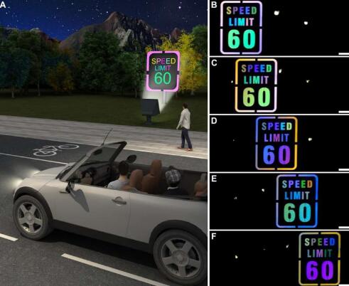 在一组实验中,研究人员利用该新薄膜打造了一个写有字母和数字的限速路标。随后,科学家们在附近放置了一盏白灯,以照亮该标志。当有一辆快速行驶的汽车经过时,司机的视角会发生变化,路标上文字的颜色似乎在闪烁。