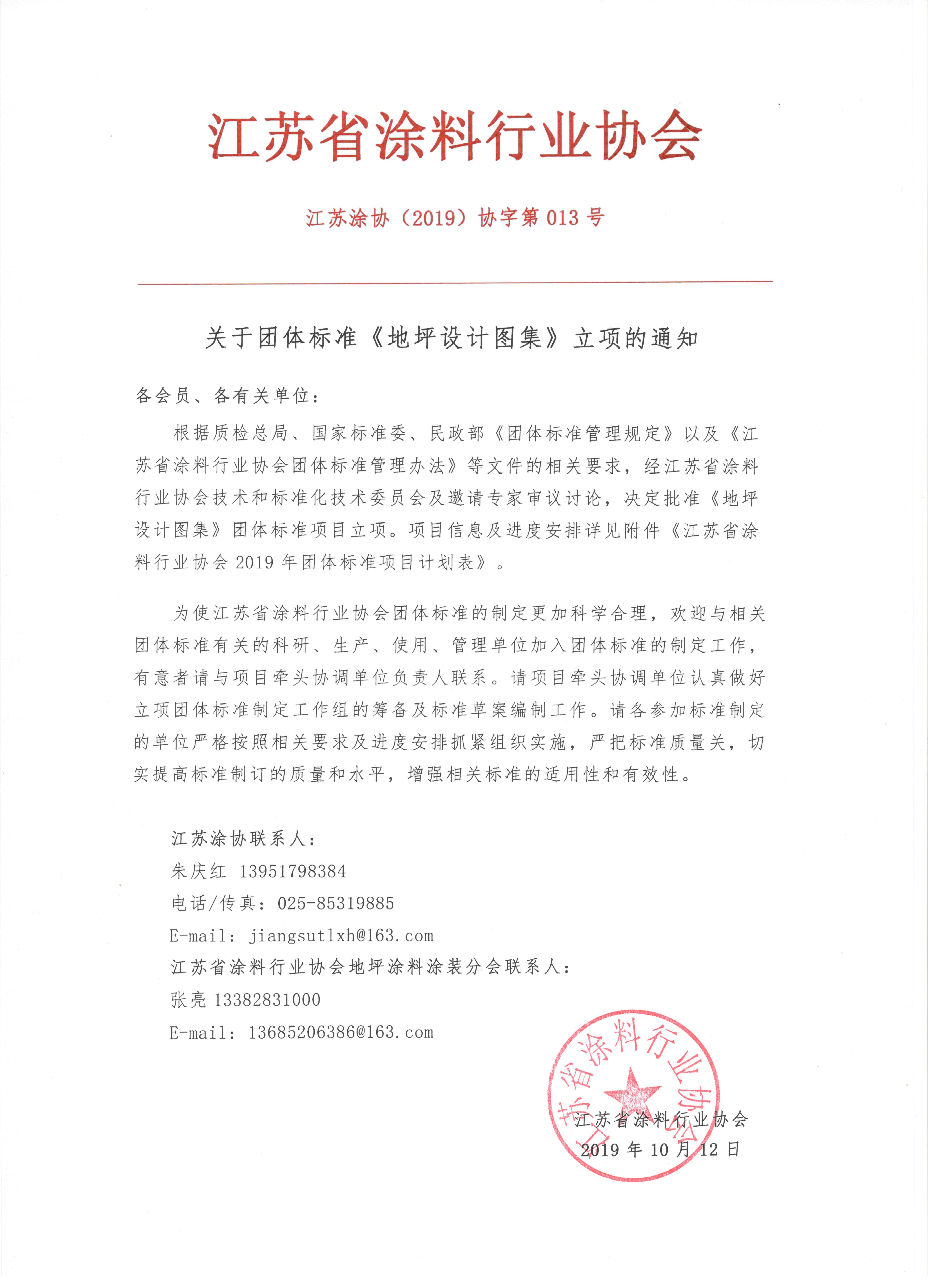 经江苏省涂料行业协会技术和标准化技术委员会及邀请专家审议讨论,决定批准《地坪设计图集》团体标准项目立项。 为使江苏省涂料行业协会团体标准的制定更加科学合理,欢迎与相关团体标准有关的科研、生产、使用、管理单位加入团体标准的制定工作,有意者请与项目牵头协调单位负责人联系。