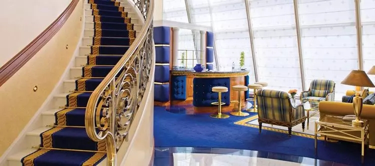 迪拜帆船酒店,1994年开工,1999年12月正式开业。耗资10亿美金。帆船酒店被世间传称为世界上首个也是唯一的一个七星级酒店。酒店建在离朱美拉海滩岸边280米远的波斯湾内的人工岛上,仅由一条弯曲的道路连结陆地,酒店的顶部设有一个由建筑的边缘伸出的悬臂梁结构的停机坪。酒店内极尽奢华,所有套房都为复式结构,每个套房中还有为客人解释各项高科技设备的私人管家。全部202间套房中,面积从170平方米到780平方米不等,最低的房价也要900美元一晚,25层的皇家套房则需18000美元一晚。大厅、中庭、套房、浴室......任何地方都是金灿灿的,连门把手、水龙头、烟灰缸、衣帽钩,甚至一张便条纸,都镀满了黄金。