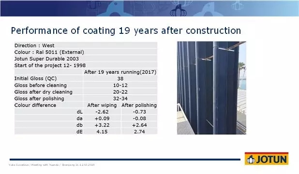 迪拜帆船酒店为了始终将它最完美的一面呈现给世界,从设计之初就对每个细节精益求精,尤其是对其外观的要求。由于酒店特殊的地理位置和所处的气候环境,因此对建材上用到的粉末产品的耐候性、盐雾、色彩及光泽度要求非常高,而Jotun Super Durable产品便是专为为了应对各种严苛的户外环境而设计,该产品通过了 Qualicoat Class 2 和 GSB Master 的认证,并且完全满足AAMA 2604的相关要求,可以提供长达25年质保。如下图所示,从帆船酒店建成到2017年我们Jotun粉末的质检人员前往实地检查为止,已经跨越了19年,在迪拜帆船使用了我们Jotun Super Durable产品的第19年,无论是颜色还是光泽度,和刚建成时的数据都所差无几,可见我们Super Durable的产品质量绝对经得起时间的考验。