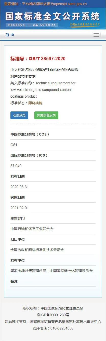 由国家工信部、国家生态环境部、国家标委会共同指导,生态环境部环境规划院、中国涂料工业协会、中国石油和化学工业联合会和中海油常州涂料化工研究院作为编制单位的国家标准《低挥发性有机化合物含量涂料产品技术要求》全文发布。