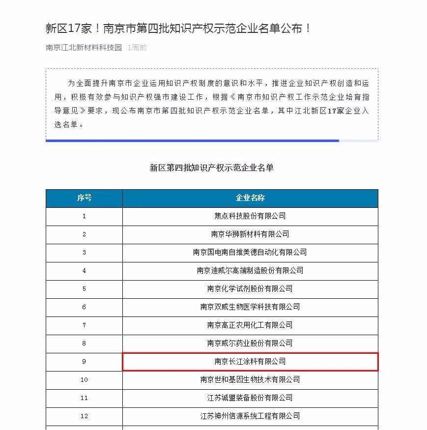 近日,南京市知识产权局公布了第四批知识产权示范企业名单,长江涂料光荣上榜,被认定为市级知识产权示范企业。