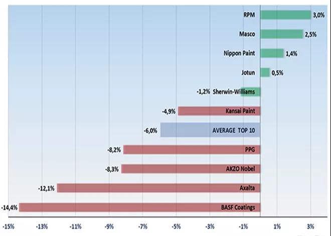 不过,由于细分市场、区域组合或收购活动的不同,各个公司呈现出了不同的变动趋势。而汽车原始设备制造商和工业涂料在其产品组合中所占比例较高的公司,表现出更多的负面发展。