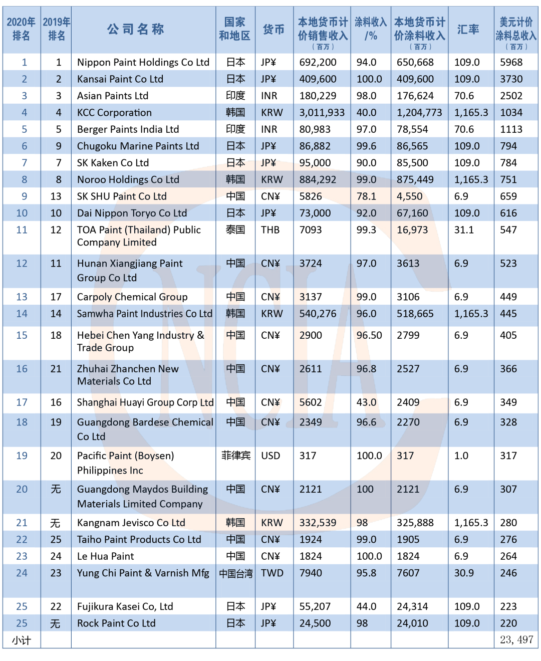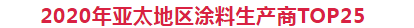“APCJ 2020年亚太地区涂料生产商25强”是基于2019年涂料收入,反映了2019年亚洲涂料市场的增长。目前,25强公司的总销售收入为235亿美元。在今年的25强公司中,有23家也包括在去年的榜单中。