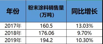据统计,2017-2019年我国热固性粉末涂料销量分别为160.5万吨、176.06万吨、194.2万吨,同比增长13.03%、9.7%、10.3%。综合来看,在国家环保及相关政策推动下,我国绿色涂料市场增势显著,“漆改粉”趋势加速。