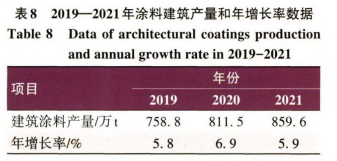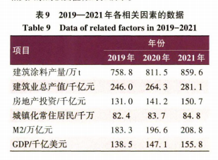 在国内良好的宏观经济下,房地产行业稳中有升的基调下,同时随着重涂市场的到来,为建筑涂料行业的发展提供了有力支持,总体来看,建筑涂料行业进入稳定发展期。预计到2021年,建筑涂料产量将会达到859. 62万t。对各涂料厂商来说,中国建筑涂料市场仍有很好的市场潜力和存在良好的机遇,各涂料厂商应理性进行营销战略选择,争取更大更快的发展。在大数据时代的背景下,建筑涂料行业应该重视数据的保存和整理,应用大数据的技术来准确预测市场前景以及促进销售。当然本文还有不足之处,本文考虑的建筑涂料行业与建筑业产值、房地产投资、城镇化、M2和GDP的关联性,各因素之间存在很强的共线性。此外一些旧房翻新的面积等没有详细统计在内,因此还可以通过更多的因素和更多的数据来进行进一步的研究。
