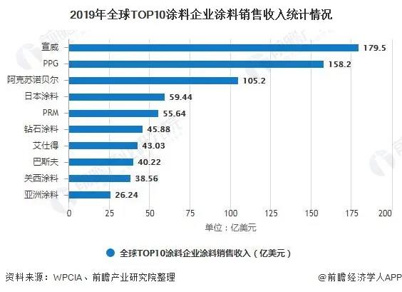 根据WPCIA数据显示,2019年,全球涂料销售排名前十涂料公司分别为:宣威(179.5亿美元)、PPG(158.2亿美元)、阿克苏诺贝尔(105.2亿美元)、日本涂料(59.44亿美元)、PRM(55.64亿美元)、钻石涂料(45.88亿美元)、艾仕得(43.03亿美元)、巴斯夫(40.22亿美元)、关西涂料(38.56亿美元)、亚洲涂料(26.24亿美元)。