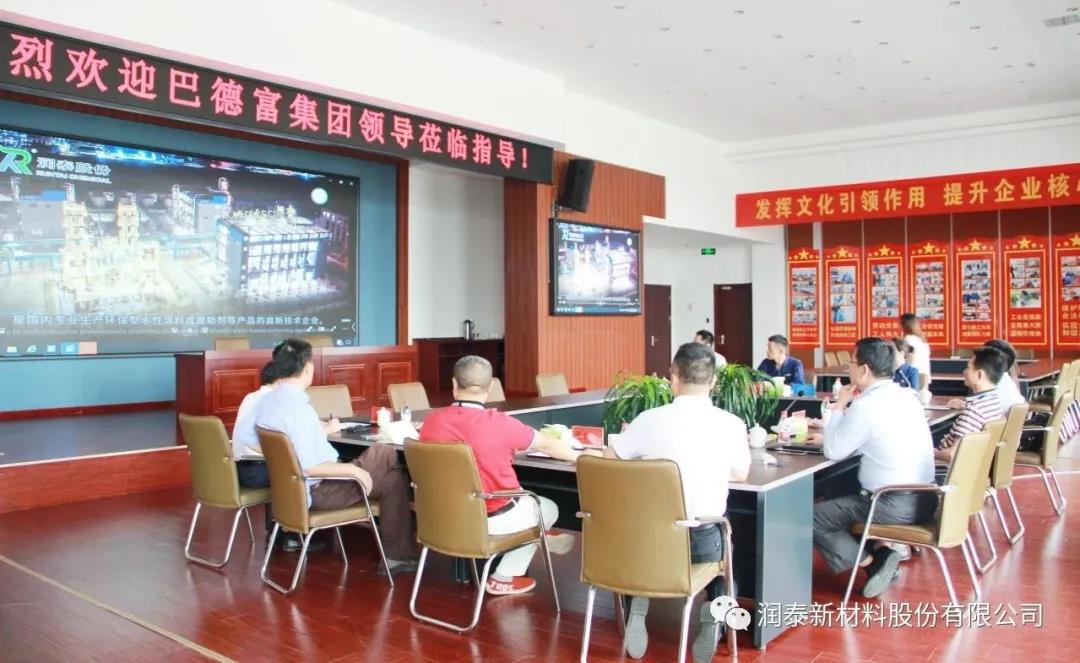 润泰股份董事长张世元对巴德富高层领导的到来表示热烈欢迎并共同观看了“厂区安全提示”相关视频。巴德富于2000年在广东顺德创立,是一家专业从事水性乳液、胶粘剂等研发、生产和销售于一体的高新技术企业。下辖有顺德、中山、上海、常熟、成都、沧州6大生产基地,约有员工2000名,年实际产能达百万吨,产品广泛应用于建筑内外墙涂料、水性木器涂料、防水涂料、水性工业涂料、水性胶粘剂等领域,是润泰化学的十强客户中的重要客户。