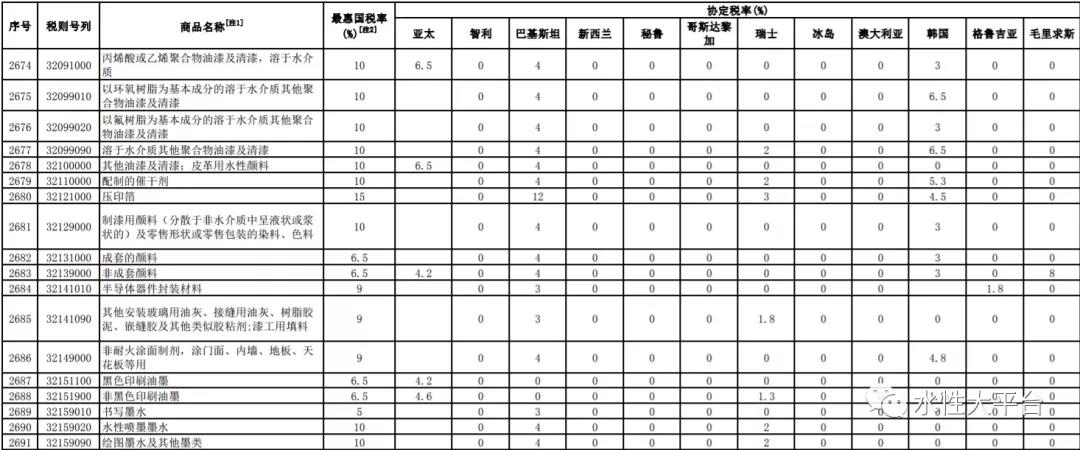 最新进口税率发布。涂料方面,包括油漆溶剂油;聚酯油漆及清洗,溶于非水介质的;分散或溶于非水介质的丙烯酸聚合物油漆及清漆、乙烯聚合物油漆及清漆、聚氨酯类油漆及清漆、其他油漆、清漆溶液。丙烯酸或乙烯聚合物油漆及清漆,溶于水介质;以环氧树脂、氟树脂为基本成分的溶于水介质其他聚合物油漆及清漆;溶于水介质其他聚合物油漆及清漆;其他油漆及清漆;皮革用水性颜料。