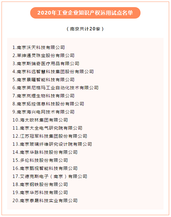 根据南京市工信局的相关报道,工信部公布2020年工业企业知识产权运用试点企业名单,南京20家企业入选!江苏冠军科技集团股份有限公司入选!