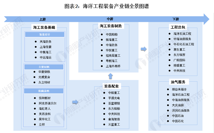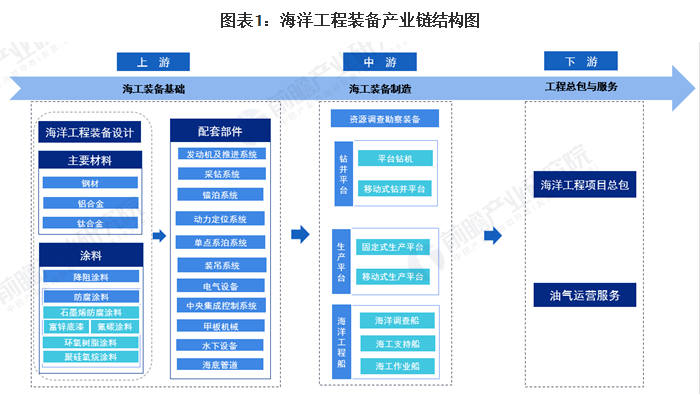从产业链来看,海洋工程装备产业链由上游海工装备基础(包括海工装备设计、原材料、防腐涂料和装备配套)、中游海洋工程装备制造和下游工程总包机服务等主要环节构成。