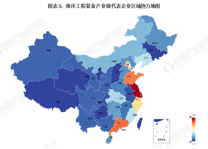 目前,中国的海洋工程装备代表企业主要集中在江苏、上海、广东、山东、浙江等沿海区域,其中,江苏海工装备产业发展领先。