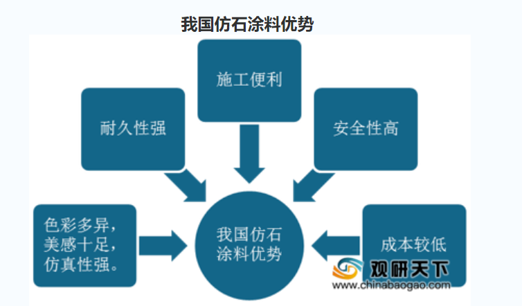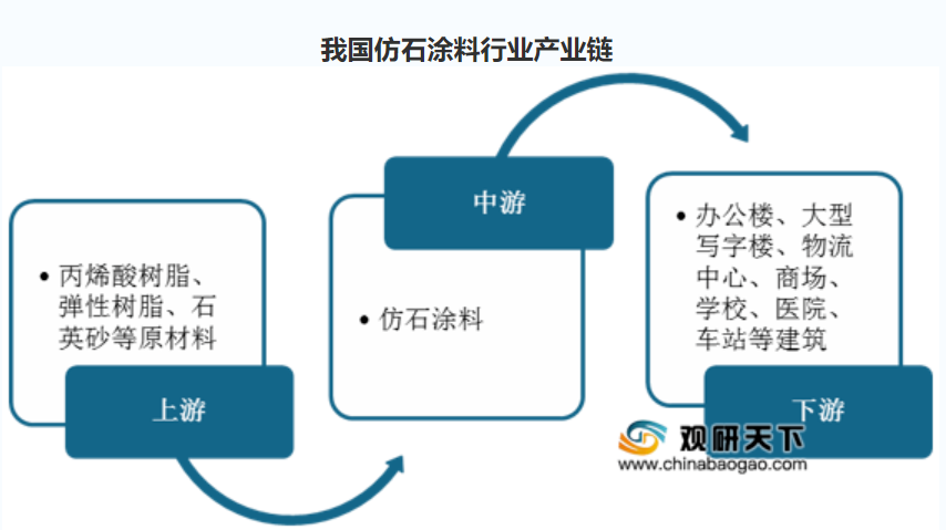 仿石涂料是以丙烯酸树脂乳液和弹性树脂溶液为基料,通过一次喷涂产生多种色彩的用于建筑物外墙的单组份涂料,它应用于仿造外墙石材效果,所以又称液态石。我国仿石涂料产业链上游主要是丙烯酸树脂、弹性树脂、石英砂等原材料,下游主要是写字楼、办公楼、学校、医院等建筑。