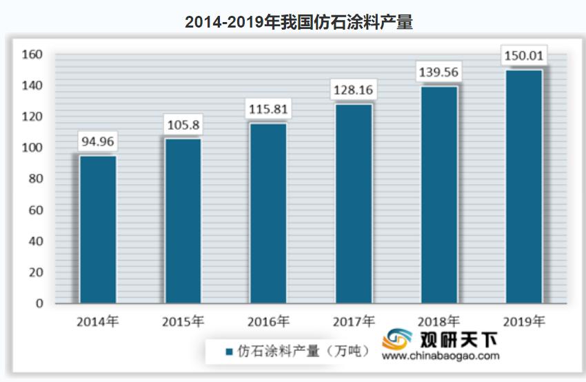 近年来,我国仿石涂料产量不断增加,未来发展空间较大。据统计,2014-2019年我国仿石涂料产量呈现出稳定增加的趋势。2014年我国仿石涂料产量为94.96万吨,2019年我国仿石涂料产量增至150.01万吨,发展趋势良好。