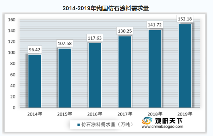 近年来,随着我国经济水平的不断提高,人们的消费水平也逐渐提高,对建筑的要求也越来越高,模拟天然石材纹理和颜色的仿石涂料迎来了发展机遇。因其特有的美感、性价比高、安全性等优势,我国仿石涂料行业发展迅速,需求量持续增加。据统计,2014-2019年我国仿石涂料需求量稳定增加。2019年,我国仿石涂料需求量达152.18万吨。