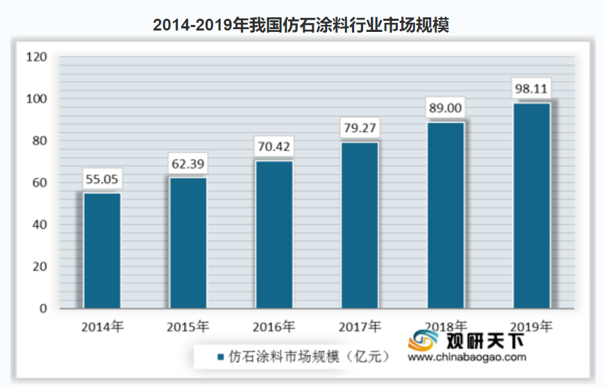 随着我国仿石涂料行业的不断发展,我国仿石涂料行业市场规模也在不断扩大。据统计,2014-2019年我国仿石涂料行业市场规模持续增长。2014年,我国仿石涂料行业市场规模为55.05亿元,2019年,我国仿石涂料行业市场规模增至98.11亿元。