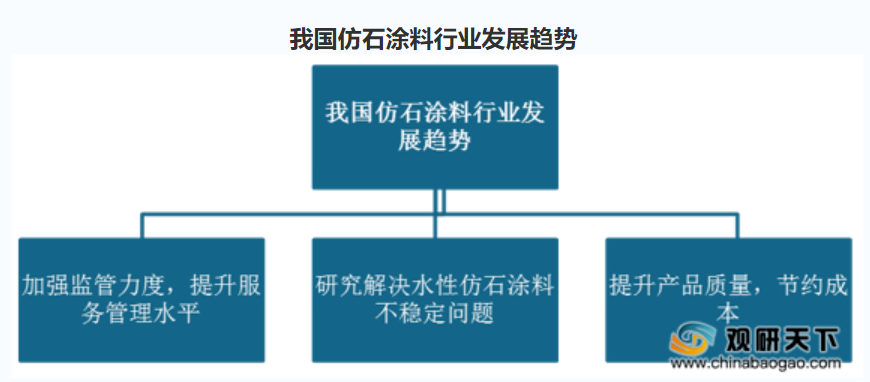 未来,我国仿石涂料行业将不断提升管理水平,加强监管力度,同时解决水性仿石涂料不稳定的问题,在保证仿石涂料产品质量的前提下尽可能节约生产成本,促使行业更为健康地发展。