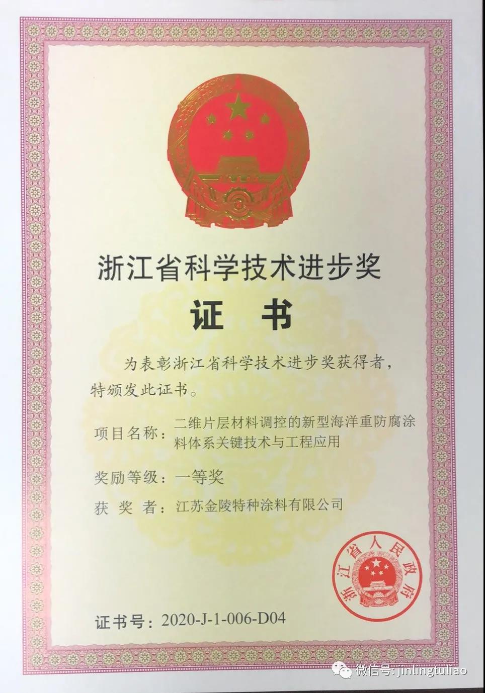 6月15日,2020年度浙江省科学技术奖励大会在省人民大会堂举行。会上,颁发301项2020年度浙江省科学技术奖,其中由中国科学院宁波材料技术与工程研究所牵头带领江苏金陵特种涂料有限公司申报的《二维片层材料调控的新型海洋重防腐涂料体系关键技术与工程应用》荣获浙江省科学技术进步一等奖称号。