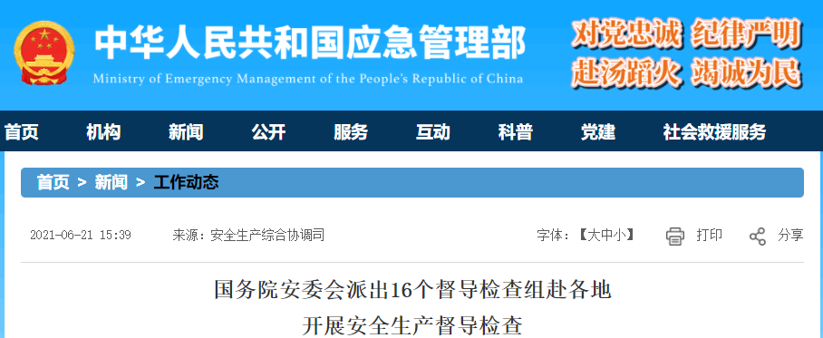 为扎实深入排查治理重点行业领域重大风险隐患,为建党100周年创造安全稳定环境,根据全国安全生产电视电话会议部署,国务院安委会派出由有关成员单位负责同志带队的16个督导检查组,从即日起至7月上旬对全国31个省(区、市)及新疆生产建设兵团开展安全生产重点督导检查工作。