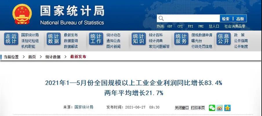 6月27日,国家统计局公布数据显示,1—5月份,全国规模以上工业企业实现利润总额34247.4亿元,同比增长83.4%,比2019年同期增长48.0%,两年平均增长21.7%。从5月份当月看,规模以上工业企业实现利润总额8299.2亿元,同比增长36.4%,比2019年同期增长44.6%,两年平均增长20.2%。5月份,原材料制造业利润同比增长1.11倍,两年平均增长32.0%,增速分别比规模以上工业高74.8和11.8个百分点,带动工业企业盈利较快增长。来源:国家统计局