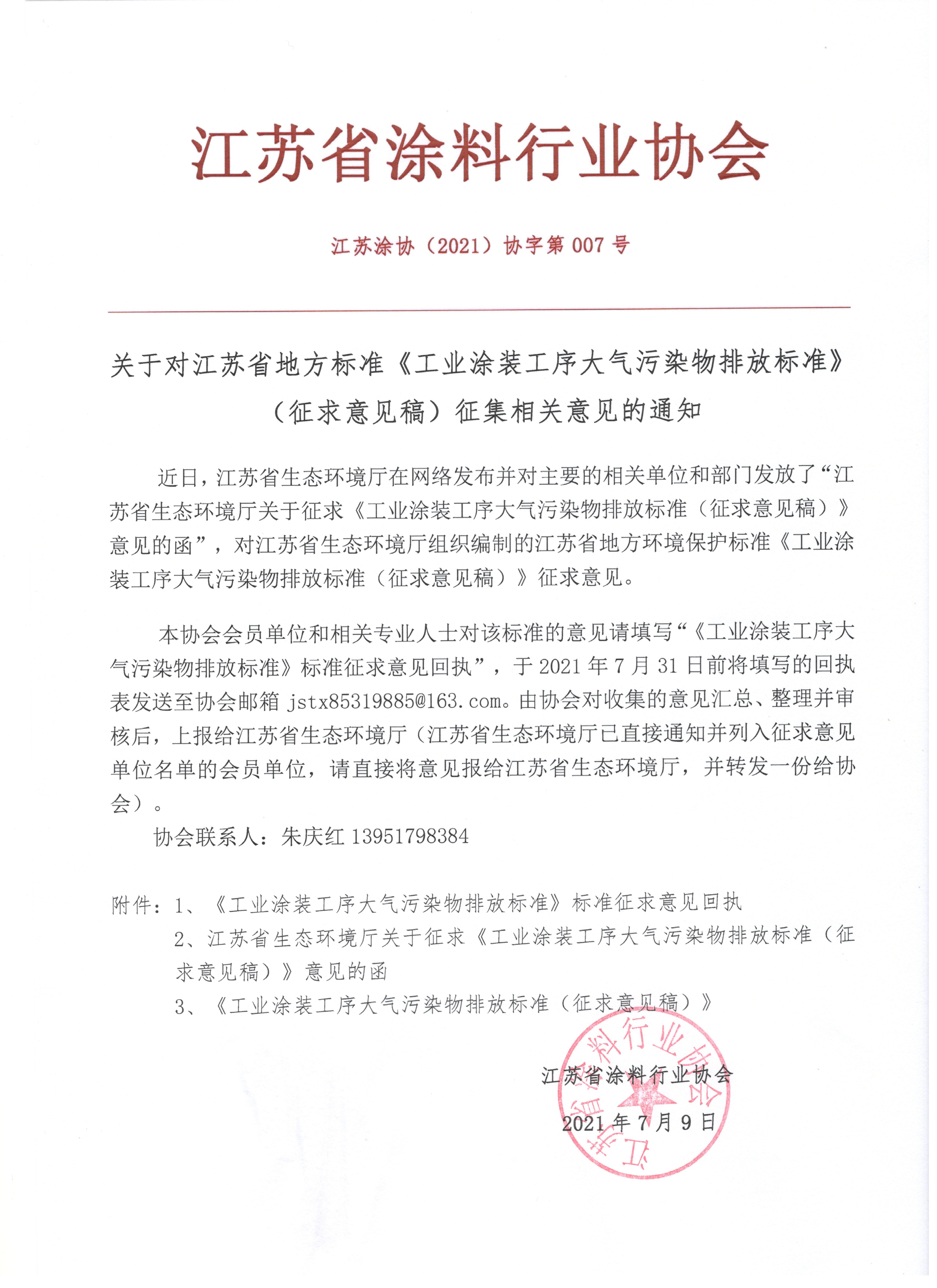 附件:《工业涂装工序大气污染物排放标准》标准征求意见回执.doc江苏省生态环境厅关于征求《工业涂装工序大气污染物排放标准(征求意见稿)》意见的函.pdf《工业涂装工序大气污染物排放标准》(征求意见稿)-20210706发布稿.pdf