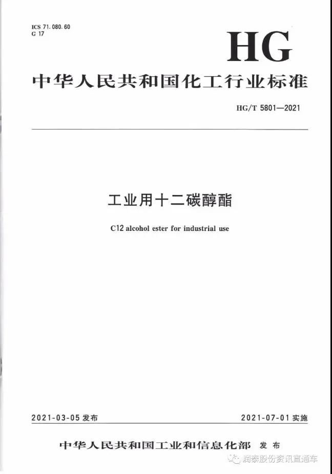 近日,由润泰新材主起草的HG/T5801-2021《工业用十二碳醇酯》行业标准,于2021年7月1日正式实施,全文也同时正式公布。
